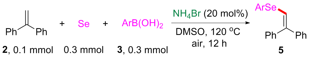 (2,2-Diphenylvinyl)(4-methoxyphenyl)selane (5d): Yellow solid, 20.1 mg, 55% yield. m.p. 85~86 ℃; 1H NMR (500 MHz, CDCl3) δ: 7.54~7.50 (m, 2H), 7.42 (t, J=7.6 Hz, 2H), 7.38~7.31 (m, 3H), 7.26~7.18 (m, 5H), 7.03 (s, 1H), 6.86 (d, J=8.6 Hz, 2H), 3.80 (s, 3H); 13C NMR (125 MHz, CDCl3) δ: 159.8, 142.1, 141.8, 140.5, 135.2, 129.5, 128.7, 128.4, 128.0, 127.23, 127.21, 124.4, 121.7, 115.2, 55.5; HRMS (ESI+) calcd for C21H19OSe [M+H]+ 367.0596, found 367.0597.