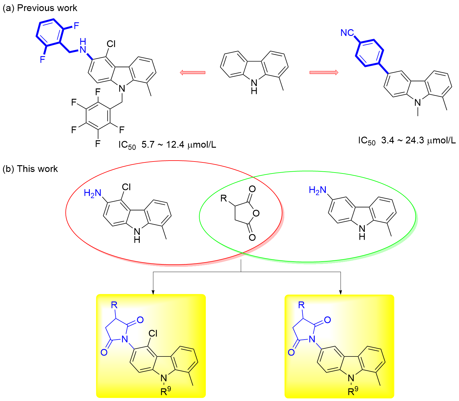 6-(N-3-氯邻苯二甲酰亚胺基)-5-氯-1,9-二甲基-β-咔啉(5b): 白色固体, 产率86.9%. m.p. 205.4~207.7 ℃; 1H NMR (400 MHz, CDCl3) δ: 8.37 (d, J=5.4 Hz, 1H), 8.28 (d, J=5.4 Hz, 1H), 7.97 (s, 1H), 7.94 (d, J=8.0 Hz, 1H), 7.79 (d, J=8.0 Hz, 1H), 7.51 (d, J=8.8 Hz, 1H), 7.47 (d, J=8.8 Hz, 1H), 4.15 (s, 3H), 3.10 (s, 3H); 13C NMR (100 MHz, CDCl3) δ: 166.36, 166.05, 142.95, 142.05, 141.28, 138.87, 136.13, 134.58, 133.61, 130.00, 128.86, 127.70, 125.21, 124.61, 124.38, 121.03, 119.46, 115.03, 108.63, 32.70, 23.81. HRMS (ESI) calcd for C21H14Cl2- N3O2 [M+H]+ 410.0457, found 410.0458.