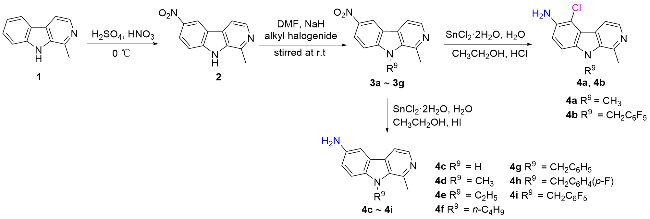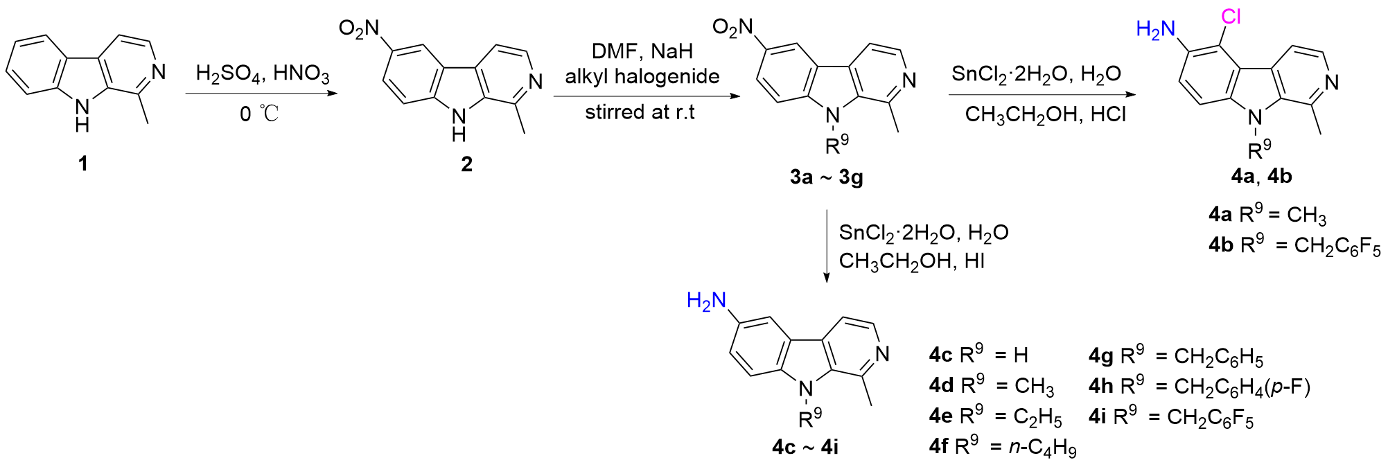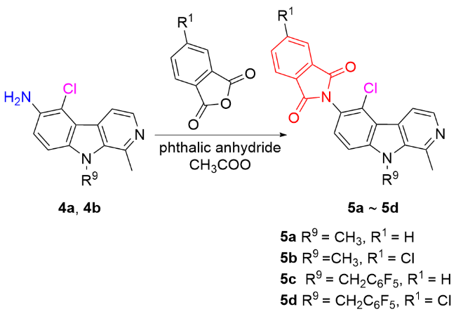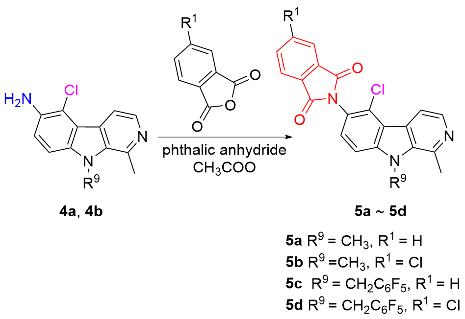 6-(N-邻苯二甲酰亚胺基)-5-氯-1,9-二甲基-β-咔啉(5a): 白色固体, 产率88.2%. m.p. 288.2~289.9 ℃; 1H NMR (400 MHz, CDCl3) δ: 8.42 (d, J=5.4 Hz, 1H), 8.39 (d, J=5.4 Hz, 1H), 8.02 (dd, J=5.4, 3.0 Hz, 2H), 7.85 (dd, J=5.2, 3.0 Hz, 2H), 7.58 (d, J=9.2 Hz, 1H), 7.54 (d, J=8.8 Hz, 1H), 4.23 (s, 3H), 3.213 (s, 3H); 13C NMR (100 MHz, CDCl3) δ: 167.23, 143.41, 141.44, 136.02, 134.56, 131.96, 129.63, 129.45, 128.70, 124.01, 121.93, 119.30, 115.55, 108.78, 32.84, 22.81. HRMS (ESI) calcd for C21H15ClN3O2 [M+H]+ 376.0847, found 376.0847.