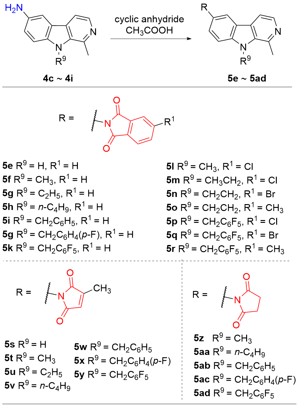 6-(N-丁二酰亚胺基)-1-甲基-9-(2,3,4,5,6-五氟苄基)-β-咔啉(5ad): 白色固体, 产率71.8%. m.p. 257.6~259.1 ℃; 1H NMR (400 MHz, CDCl3) δ: 8.39 (d, J=5.6 Hz, 1H), 8.03 (s, 1H), 7.80 (d, J=4.4 Hz, 1H), 7.47~7.36 (m, 2H), 5.94 (s, 2H), 3.09 (s, 3H), 3.00~2.92 (m, 4H); 13C NMR (100 MHz, CDCl3) δ: 176.60, 146.48 (m), 144.05(m), 142.58 (m), 141.73, 140.32, 139.26, 136.54 (m), 136.10, 129.05, 126.80, 124.80, 122.49, 120.22, 113.33, 110.22 (m), 109.96, 37.96, 28.47, 23.96. HRMS (ESI) calcd for C23H15F5N3O2 [M+H]+ 460.1078, found 460.1076.