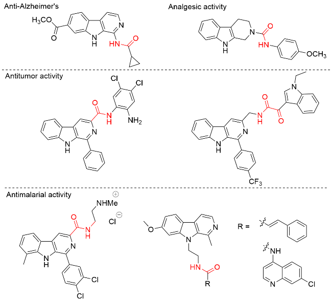 6-(N-丁二酰亚胺基)-1-甲基-9-正丁基-β-咔啉(5aa): 白色固体, 产率58.9%. m.p. 184.6~185.7 ℃; 1H NMR (400 MHz, CDCl3) δ: 8.34 (d, J=5.2 Hz, 1H), 8.03 (d, J=1.6 Hz, 1H), 7.80 (d, J=5.2 Hz, 1H), 7.54 (d, J=8.8 Hz, 1H), 7.45 (dd, J=8.8, 1.8 Hz, 1H), 4.63~4.47 (m, 2H), 3.06 (s, 3H), 2.97 (s, 4H), 1.87~1.79 (m, 2H), 1.51~1.41 (m, 2H), 0.99 (t, J=7.4 Hz, 3H); 13C NMR (100 MHz, CDCl3) δ: 176.77, 141.60, 141.02, 138.17, 135.63, 128.79, 126.38, 123.73, 121.65, 120.09, 113.19, 110.43, 44.97, 32.90, 28.48, 23.45, 20.20, 13.86. HRMS (ESI) calcd for C20H22N3O2 [M+H]+ 336.1706, found 336.1707.