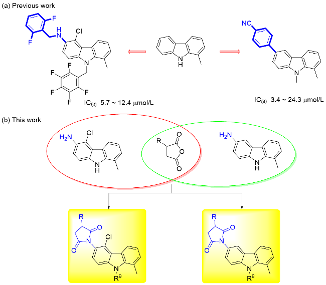 6-(N-衣康酰亚胺基)-1-甲基-9-乙基-β-咔啉(5u): 白色固体, 产率55.1%. m.p. 195.6~196.8 ℃; 1H NMR (400 MHz, CDCl3) δ: 8.33 (d, J=5.2 Hz, 1H), 8.05 (s, 1H), 7.79 (d, J=5.2 Hz, 1H), 7.52 (d, J=8.8 Hz, 1H), 7.49(d, J=8.8 Hz, 1H), 6.57~6.46 (m, 1H), 4.61 (q, J=7.2 Hz, 2H), 3.06 (s, 3H), 2.21 (s, 3H), 1.45 (t, J=7.2 Hz, 3H); 13C NMR (100 MHz, CDCl3) δ: 171.22, 170.21, 145.85, 141.56, 140.18, 138.29, 135.39, 128.83, 127.46, 126.49, 123.50, 121.75, 119.91, 113.15, 110.02, 39.72, 23.42, 15.69, 11.26. HRMS (ESI) calcd for C19H18N3O2 [M+H]+ 320.1393, found 320.1392.