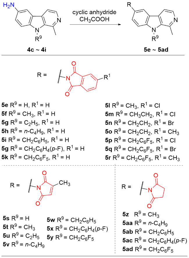 6-(N-丁二酰亚胺基)-1-甲基-9-苄基-β-咔啉(5ab): 白色固体, 产率54.0%. m.p. 196.2~197.1 ℃; 1H NMR (400 MHz, CDCl3) δ: 8.36 (d, J=5.2 Hz, 1H), 8.07 (s, 1H), 7.83 (d, J=5.2 Hz, 1H), 7.43 (d, J=8.6 Hz, 1H), 7.39 (d, J=8.6 Hz, 1H), 7.28~7.26 (m, 3H), 6.99 (d, J=7.2Hz, 2H), 5.78 (s, 2H), 2.95 (s, 4H), 2.88 (s, 3H); 13C NMR (100 MHz, CDCl3) δ: 176.76, 142.04, 141.36, 138.76, 137.49, 136.05, 128.95, 127.71, 126.69, 125.42, 124.20, 121.74, 120.10, 113.22, 110.58, 48.39, 28.49, 23.12. HRMS (ESI) calcd for C23H20N3O2 [M+H]+ 370.1550, found 370.1551.
