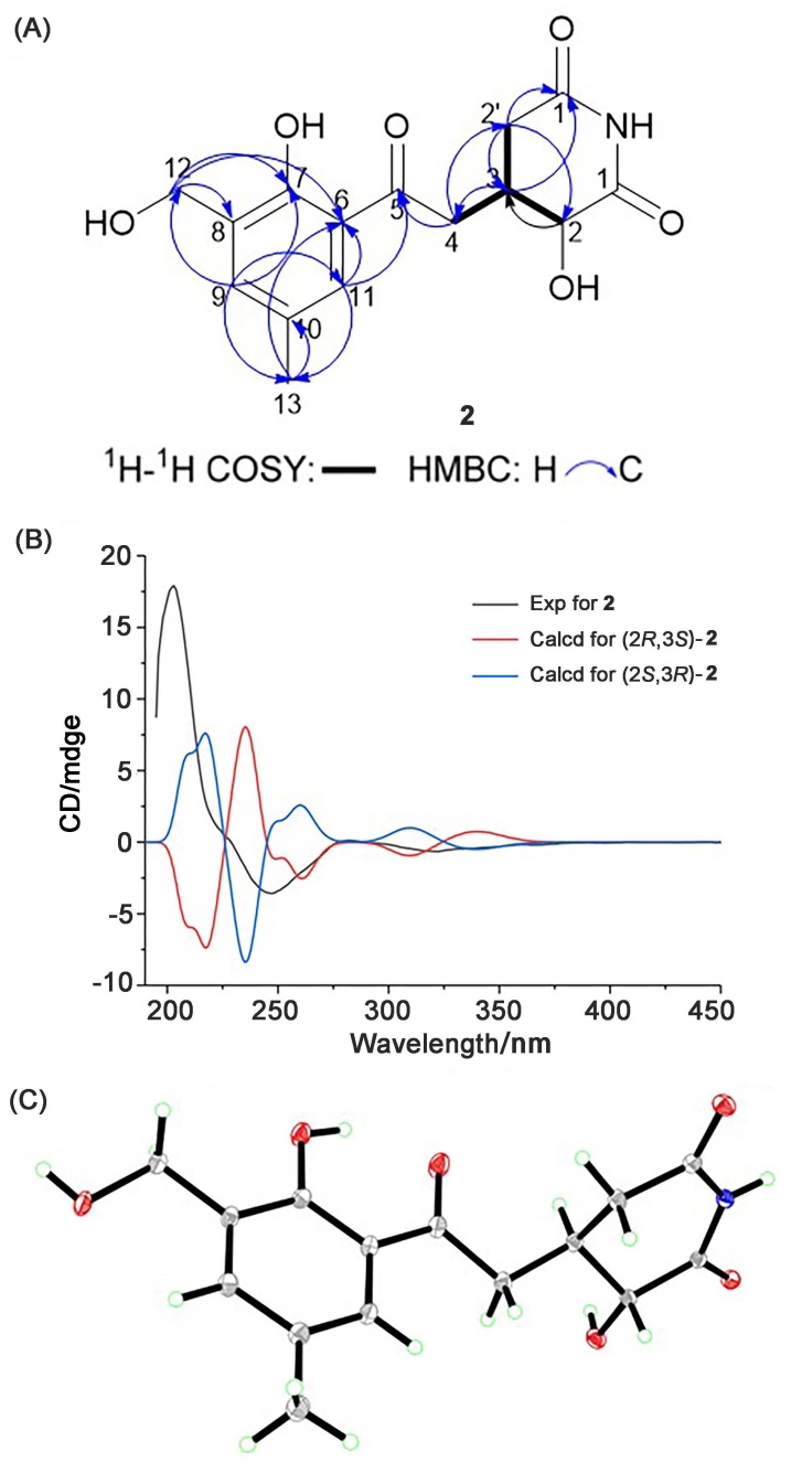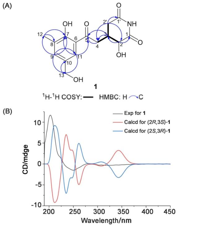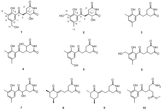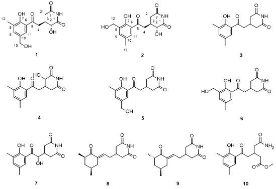 1 was achieved through detailed NMR analysis and comparison with the known analog 3-[2-[2-hydroxy-3-methylphenyl-5-(hydroxymethyl)]-2-oxoethyl] glutarimide (