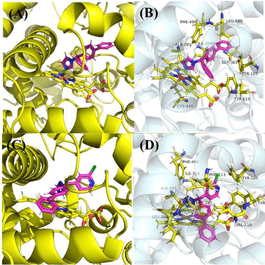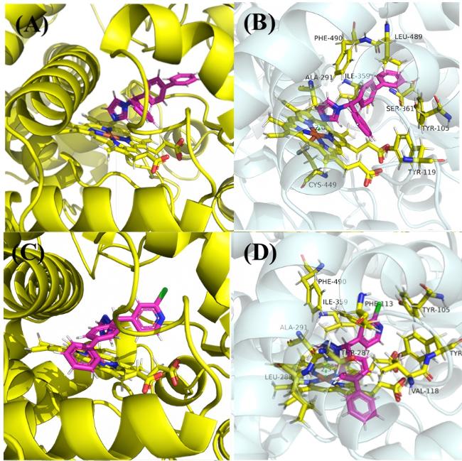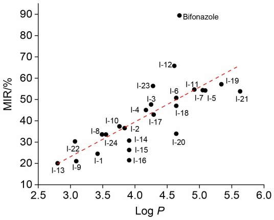 To investigate pyridine's influence on azole fungicides, 24 novel pyridine-containing 1-azolyl-1,1-diarylmethanes derivatives were synthesized using bifonazole as the lead compound and pyridinyl diaryl ketone molecules plug-in as the raw materials. Their antifungal activities against 10 plant pathogenic fungi were evaluated in vitro. Several compounds exhibited promising inhibitory effects, particularly I-12, I-21 and I-23, which showed significant efficacy against Sclerotinia sclerotiorum, Fusarium graminearum, Botrytis cinerea and Pythium aphanidermatum. Notably, compound I-23 showed equivalent efficacy (EC50=14.03 mg/L) to bifonazole (14.87 mg/L) against P. aphanidermatum. Structure-activity relationship analysis revealed that imidazole-substituted derivatives generally exhibited higher activity, while bulky substituents on phenyl rings and increased hydrophobicity positively influenced the fungicidal effects. Molecular docking studies further elucidated the possible binding mechanisms between these compounds and target proteins.