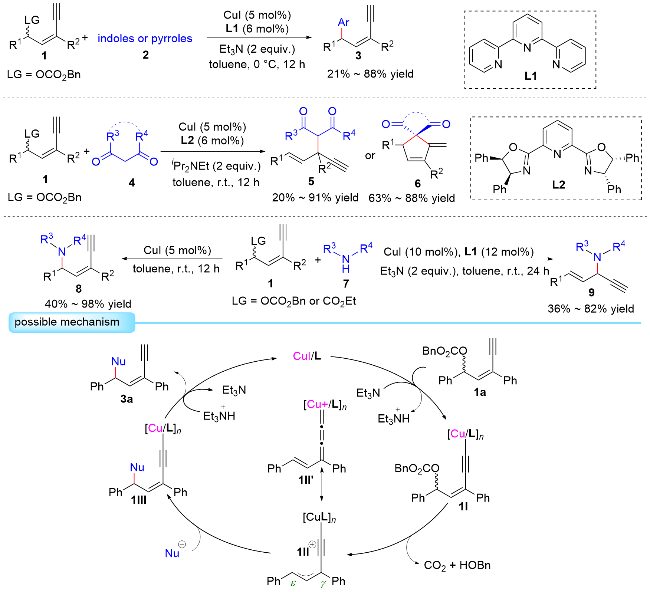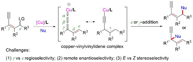 Copper-catalyzed remote yne-allylic substitution system is efficient approach for constructing functional molecules containing unsaturated bonds, and a variety of new catalytic systems and reaction modes have been successfully developed. Yne-allylic ester substrates with remote leaving groups are converted into copper vinyl-allenylidene intermediates under the cooperative catalysis of copper/ligands. The nucleophilic addition of nucleophiles to the γ-position or ε-position of the intermediates can efficiently construct important skeletons such as structurally diverse 1,3-enynes, 1,4-enynes, allenes, spirocyclic compounds, and C-C/C-N/N-N axially chiral compounds. From the perspective of classification by nucleophile types, this article systematically summarizes the latest research progress of copper-catalyzed remote yne-allylic substitution reactions involving various nucleophiles such as carbon, nitrogen, and sulfur. It focuses on the discussion of reaction mechanisms and prospects for the future development direction of this field.